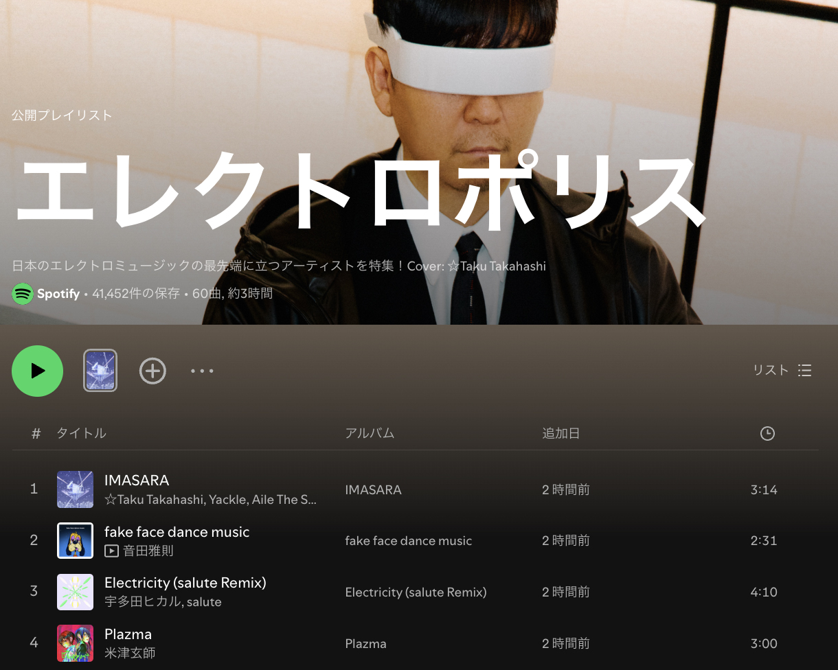 【☆Taku Takahashi】Spotify公式プレイリスト「エレクトロポリス」カバーに! 2025.04.30 ニュース BIG UP!から配信された☆Taku TakahashiがSpotifyの公式プレイリスト「エレクトロポリス」にてカバー起用されました! ありがとうございます! 新曲の☆Taku Takahashi & Yackle feat. Aile The Shota , PORIN「IMASARA」と共に、プレイリストも是非チェックしてみてください。 SNSで記事をシェアしよう!