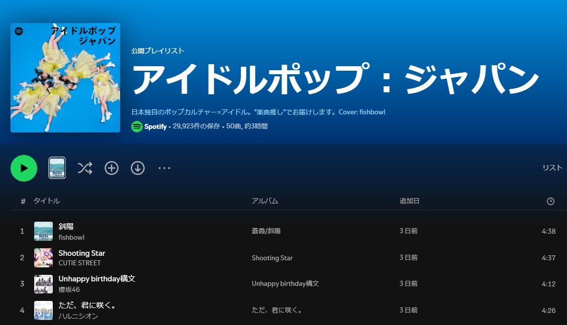 【fishbowl】Spotify公式プレイリスト「アイドルポップ:ジャパン」カバーに! 2025.10.18 ニュース BIG UP! から配信中のfishbowlが、Spotifyの公式プレイリスト「アイドルポップ:ジャパン」のカバーに起用されました! 最新シングル「蒼霞/斜陽」と共に、プレイリストも是非チェックしてみてください。 SNSで記事をシェアしよう!