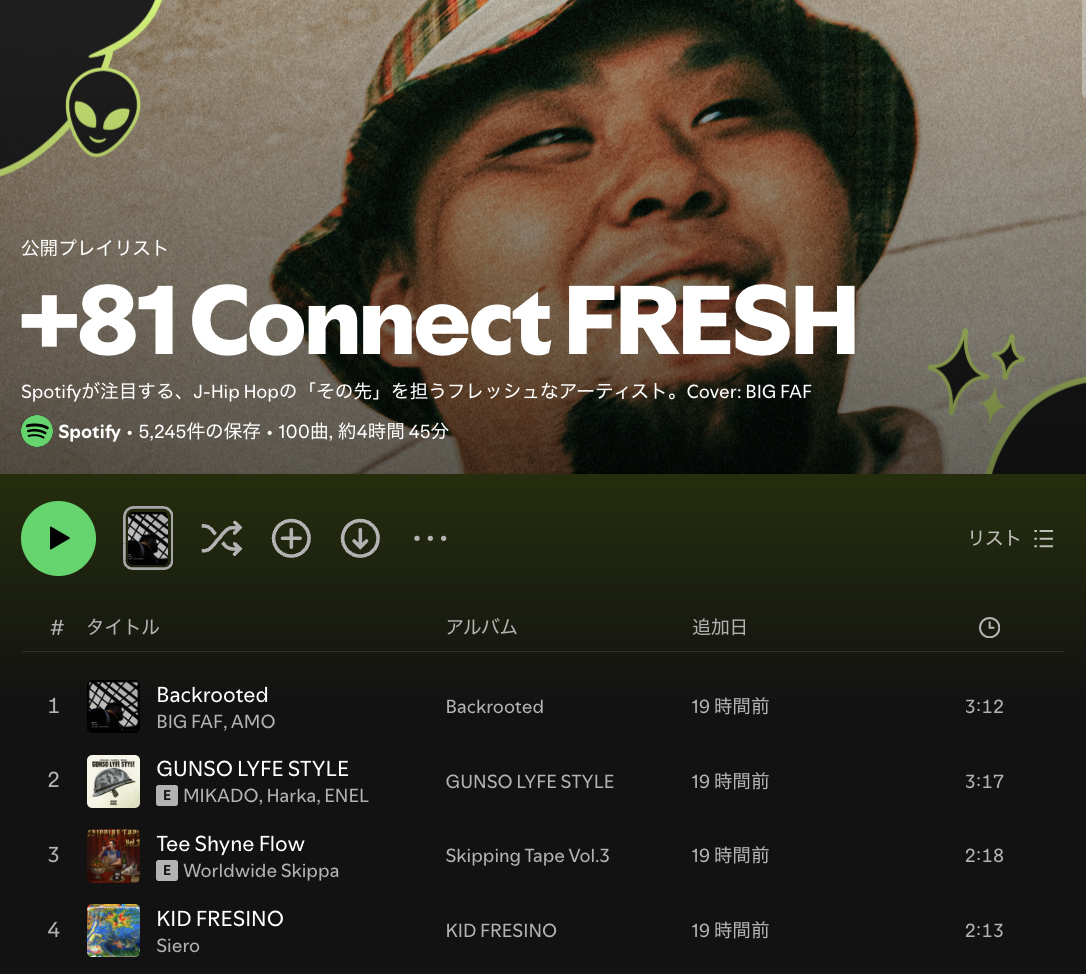 【BIG FAF】Spotify公式プレイリスト「+81 Connect FRESH」カバーに! 2025.10.22 ニュース BIG UP!から配信されたBIG FAFがSpotifyの公式プレイリスト「+81 Connect FRESH」にてカバー起用されました! ありがとうございます! 新曲「Backrooted feat. AMO」と共に、プレイリストも是非チェックしてみてください。 SNSで記事をシェアしよう!
