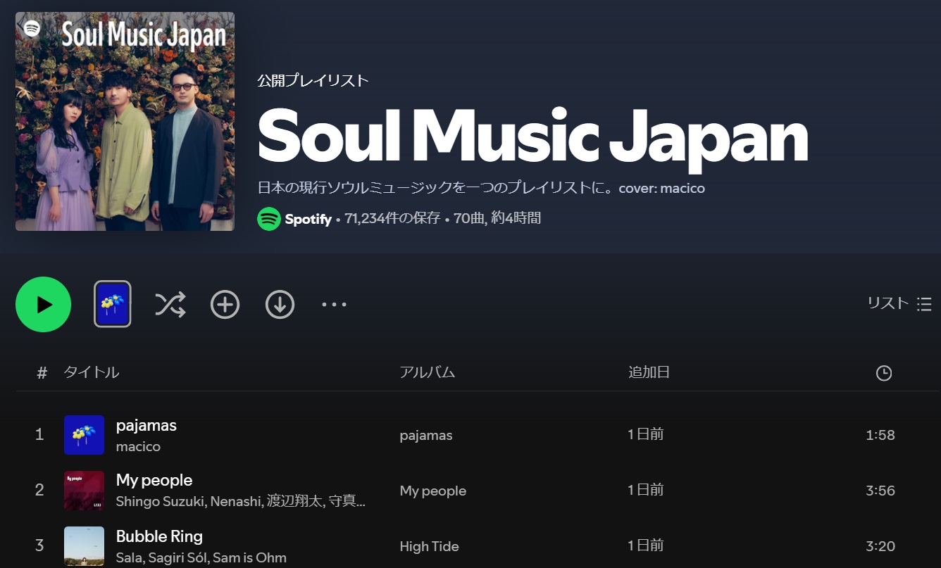 【macico】Spotify公式プレイリスト「Soul Music Japan」カバーに! 2025.12.17 ニュース BIG UP! で配信中のmacicoが、Spotifyの公式プレイリスト「Soul Music Japan」のカバーになりました! 新曲「pajamas」と合わせて、プレイリストもぜひチェックしてみてください。 SNSで記事をシェアしよう!